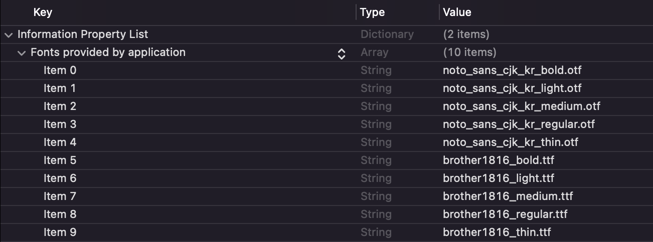 2. info.plist 안에 Fonts provided by application을 만들고 아이템을 지정했는지 확인한다.